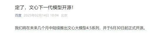2月14日,百度官宣,将在未来几个月中陆续推出文心大模型4.5系列,并于6月30日起正式开源。